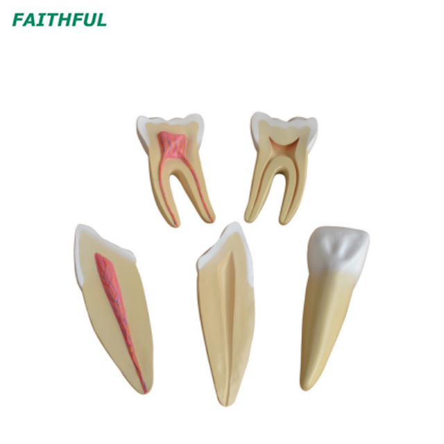 Este modelo mostra as diferenças morfológicas dos dentes incisivos, caninos e molares. As dissecções dos dentes caninos e molares demonstram a estrutura do esmalte, cavidade pulpar dental.