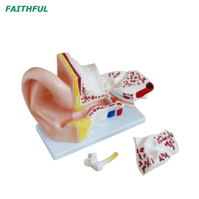 Este modelo mostra três partes estruturais principais do órgão auditivo (orelha externa, orelha média, EA interna e a posição do órgão de equilíbrio do corpo humano.