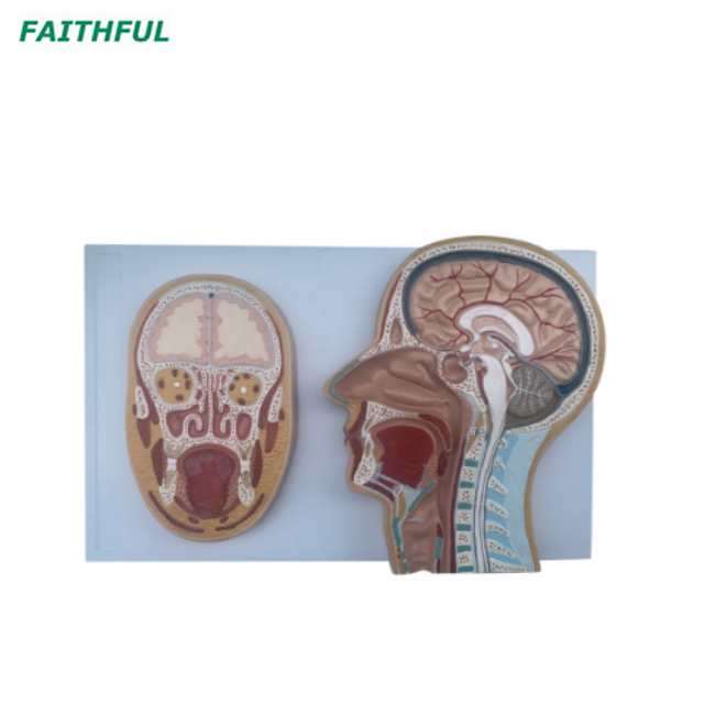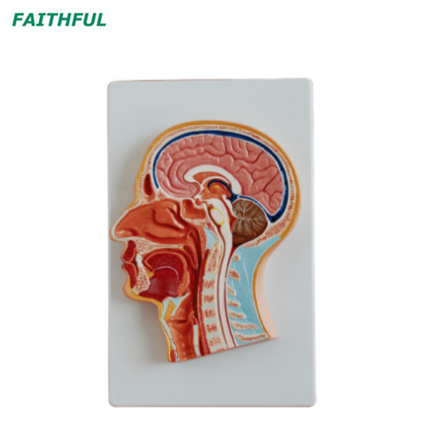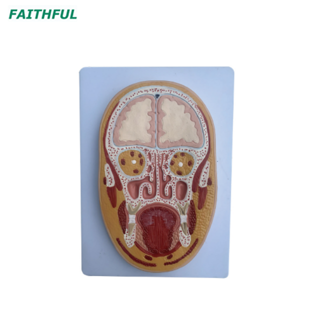 Este modelo mostra a seção frontal da cabeça que passa pela espinha cranial, cérebro frontal, orbita direita e esquerda, cavidade nasal, cavidade offaringe e cavidade oral.