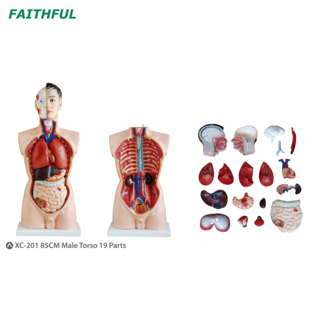 Este é um torso masculino em tamanho real. Pintado à mão e meticulosamente montado para simular a anatomia humana. Dissecações em 19 partes: tronco, cabeça (2 partes), cérebro, pulmão (4 partes), coração, traquéia, esôfago e aorta descendente, diafragma, estômago, duodeno com pâncreas e baço, intestinos, rim, bexiga (2 partes) e fígado.