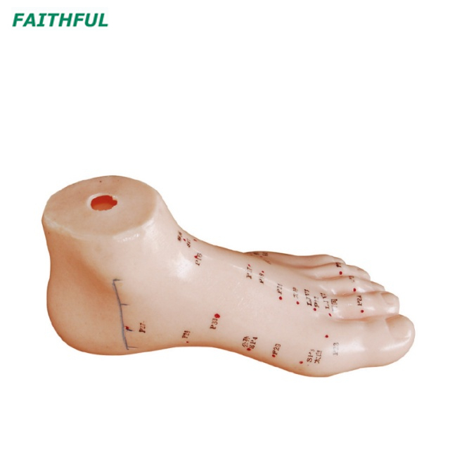 Este modelo de acupuntura de pé de PVC suave mostra os locais e as indicações dos pontos de acupuntura do pé marcados com caracteres ou numerais chineses.